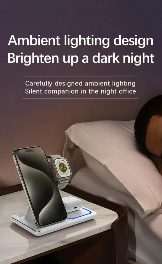 3-in-1 LED Fast Wireless Charger Stand – Foldable Charging Station for iPhone, Apple Watch & AirPods (Black/White)