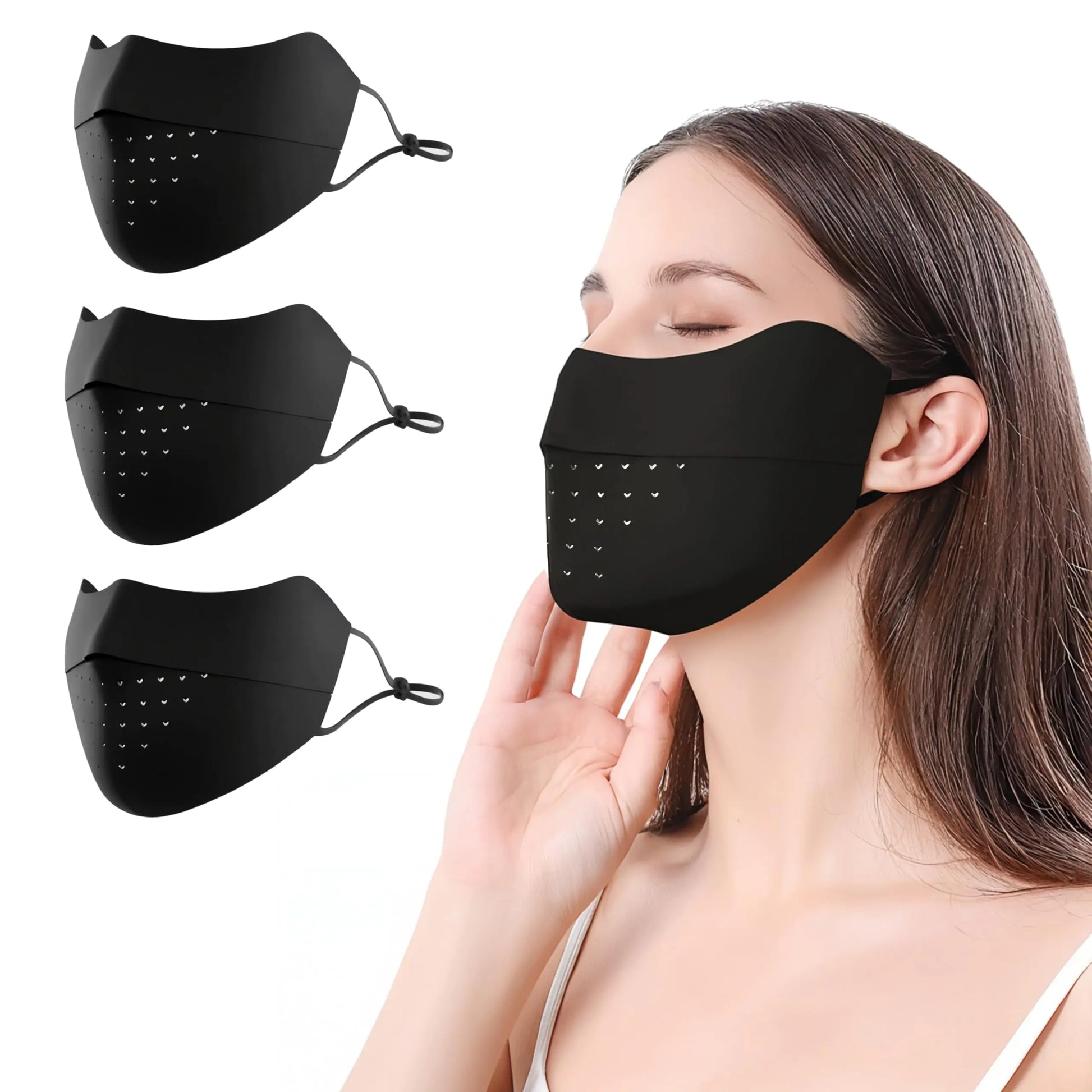 DescriptionUV Face Mask Washable Reusable Breathable Sun Protection Golf Sports Face Mask UPF 50+ Men WomeTechnology Sunscreen to keep your skin cool dry and works smart to block UVA/UVB radiation while feeling soft and lightweigh Invisible opening more breathable no foggingThe bottom half of the mask is very thin. Sun UV Protection face mask comes equipped with adjustable elastic band ear straps to ensure a perfect and secure fit that doesnt pull on your ears while wearing.