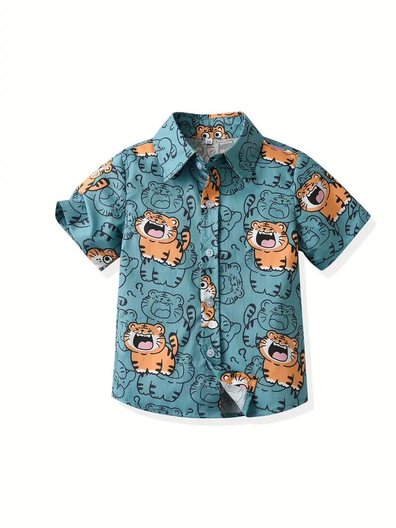 Dress your child in style and comfort this summer with our Boys Cartoon Cute Tiger Print Short Sleeves Shirt! Perfect for playdates, family outings, or just lounging at home, it's a versatile addition to any young boy's wardrobe.
