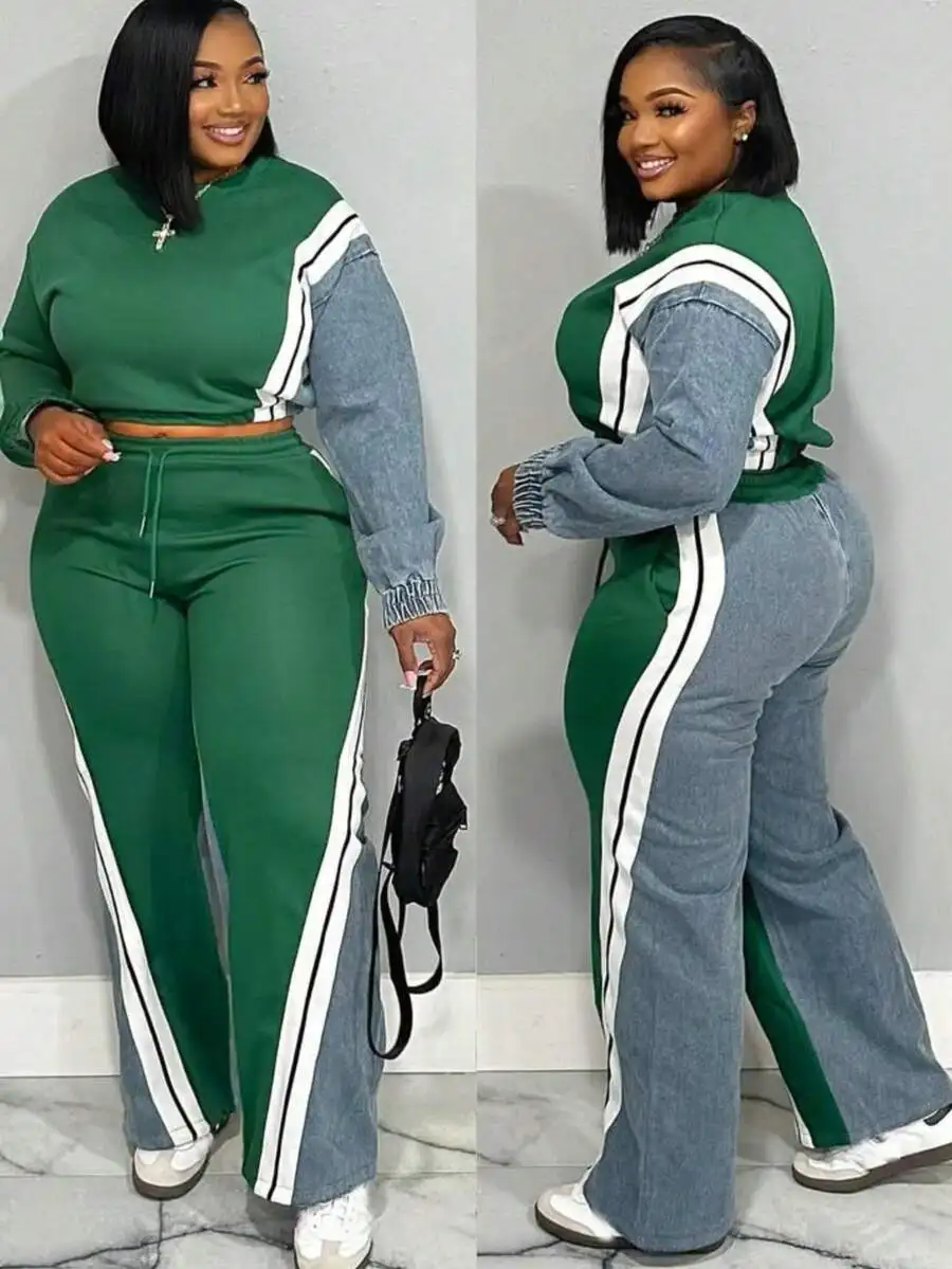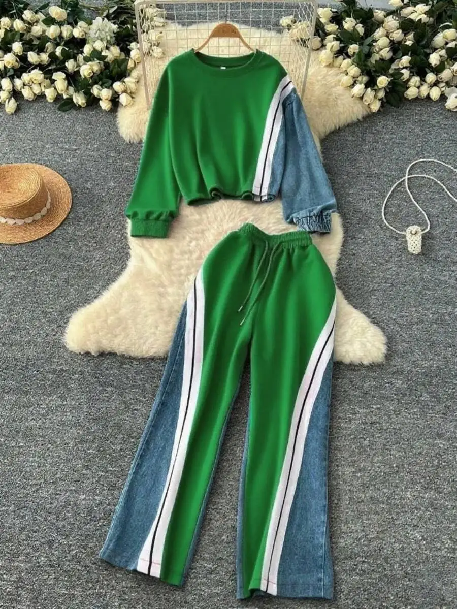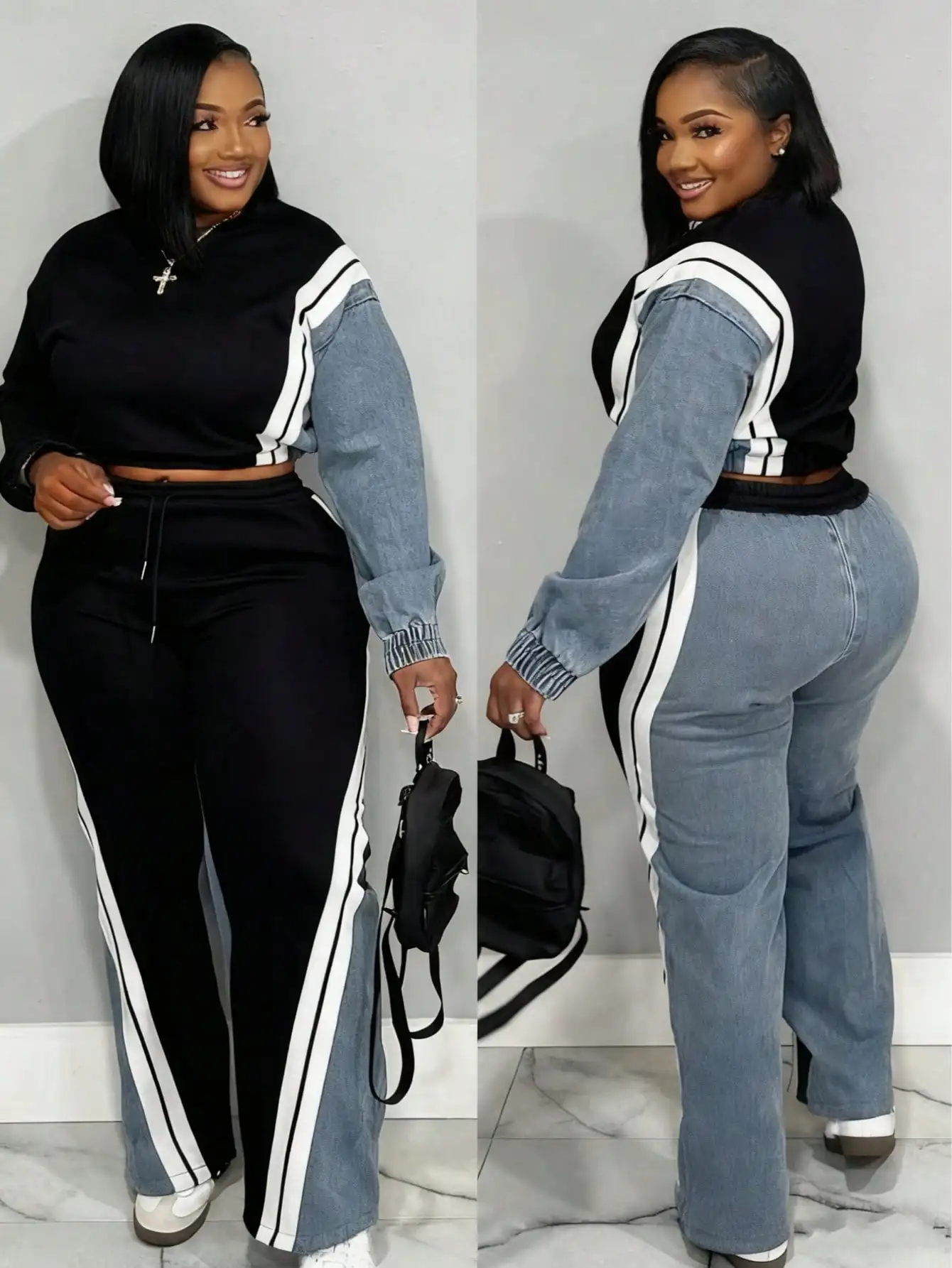BWQ Women's Denim Patchwork Co-Ord Set - Matching Jeans Set With Color Block Design | Long Sleeve Tracksuit & Contrast Stitching