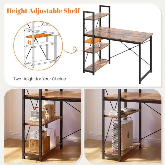 The gaming table is designed with 4 shelves, providing ample storage space for your files, books, and other necessities. The reversible gaming table is suitable for both left-handed and right-handers. The second shelf can be adjusted to 2 different heights and is removable, ensuring that the gaming table can accommodate your tower, PS5, or other gaming setups. Desk.
