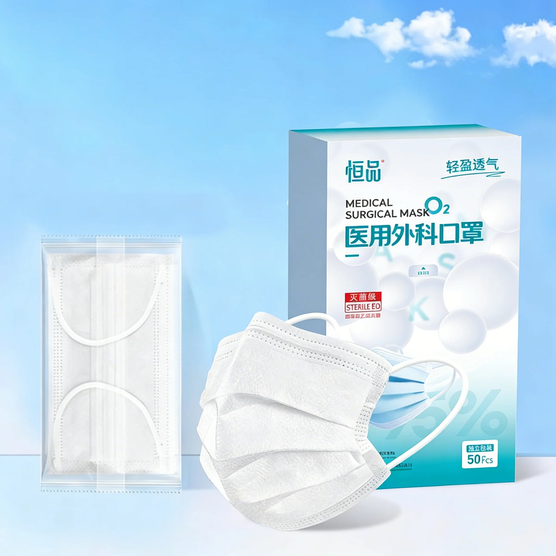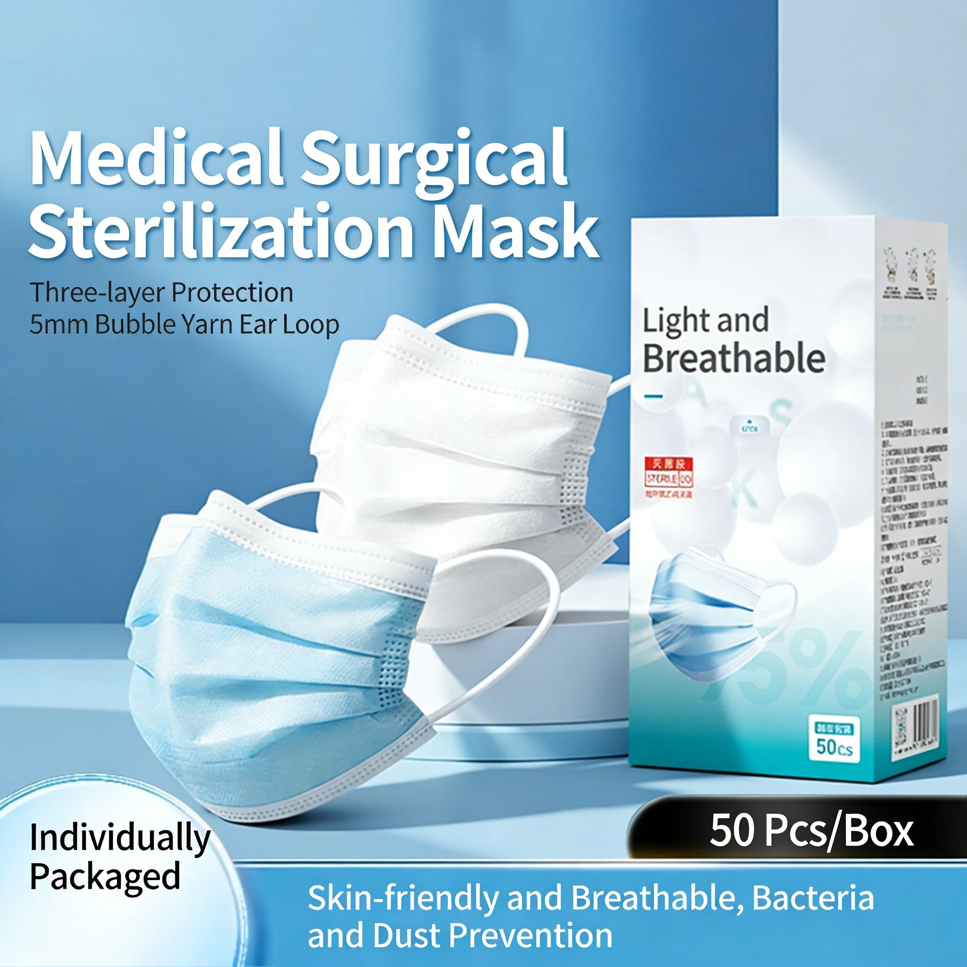 Disposable Face Masks with 5MM Bubble Yarn Ear Loops Individually Wrapped 3-Layer Protective Masks for Adult Daily Use 50ct Box
