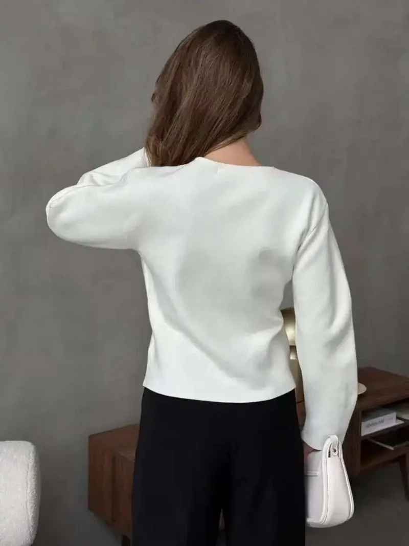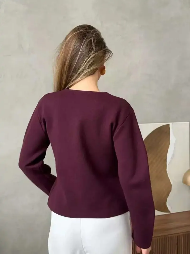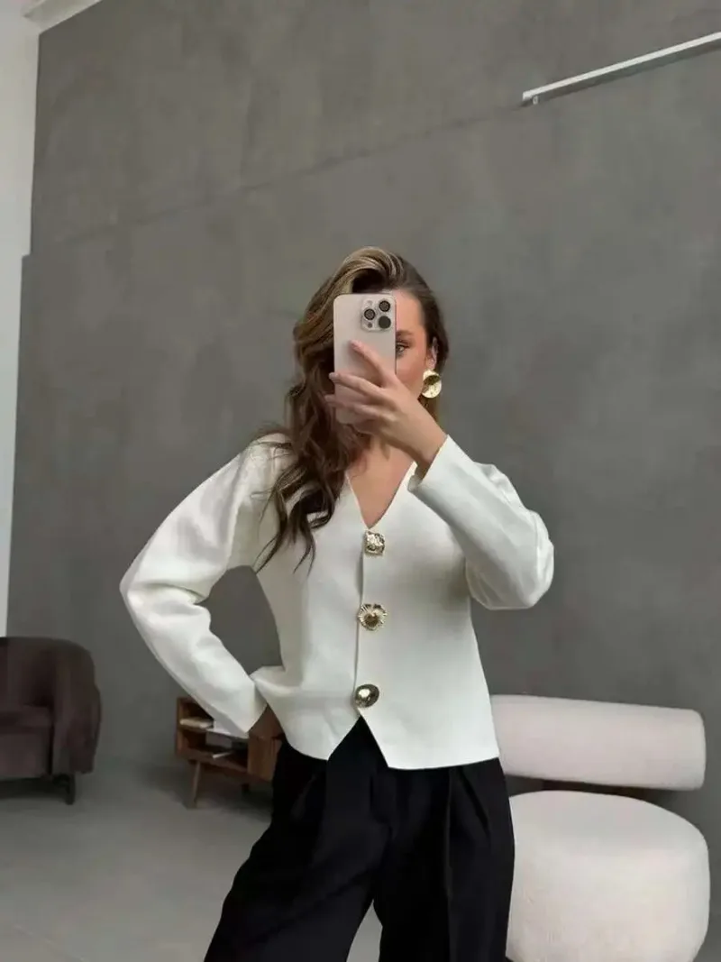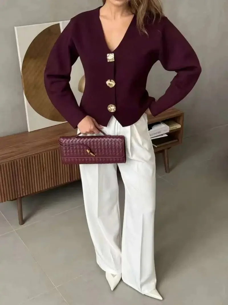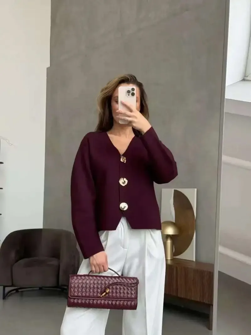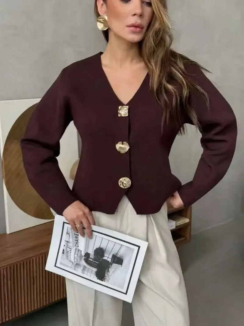 Fashion Simple Commuting Button V-neck Short Knitted Cardigan 2025 New Autumn and Winter Women's Solid Long-sleeved Sweater