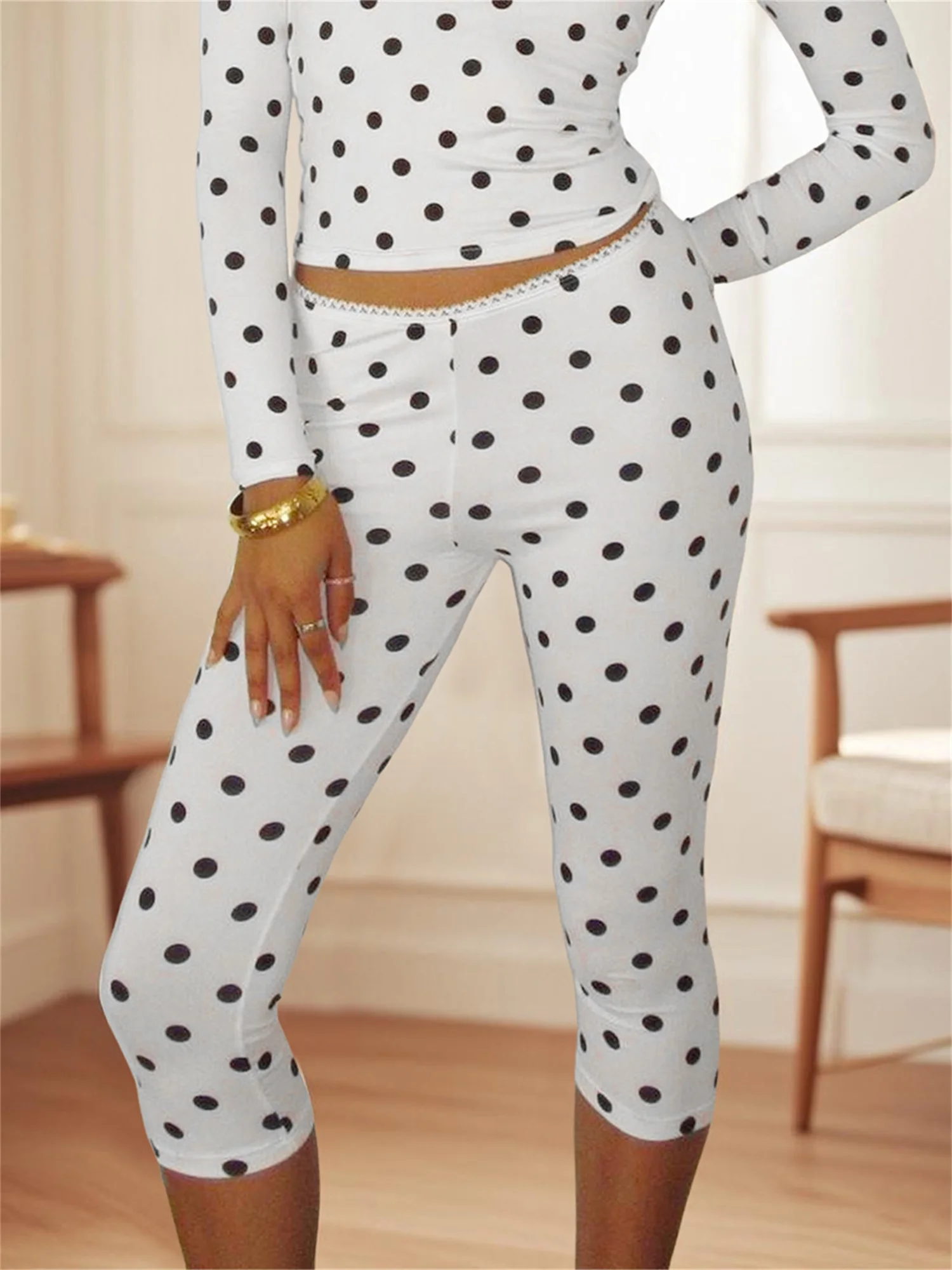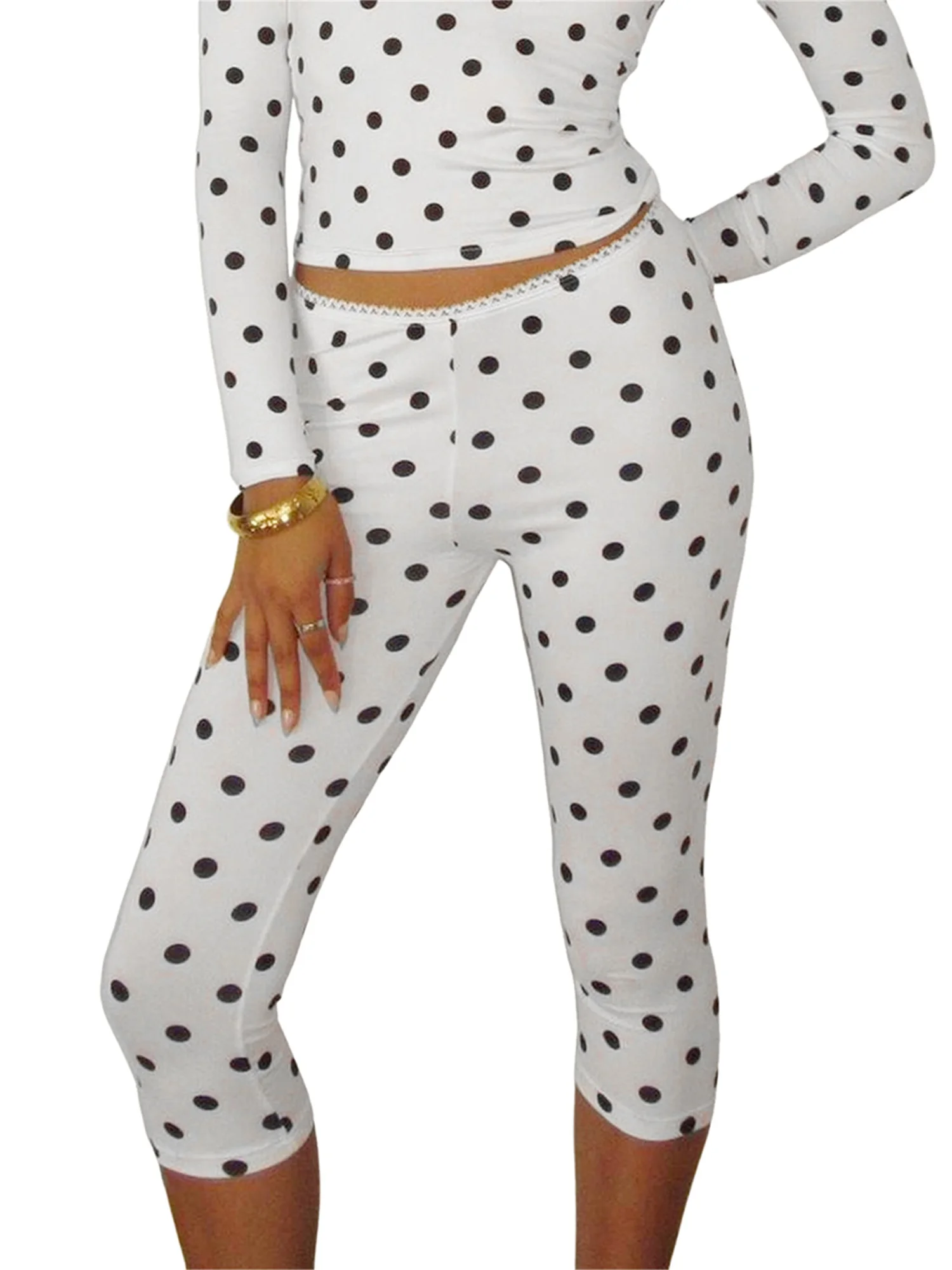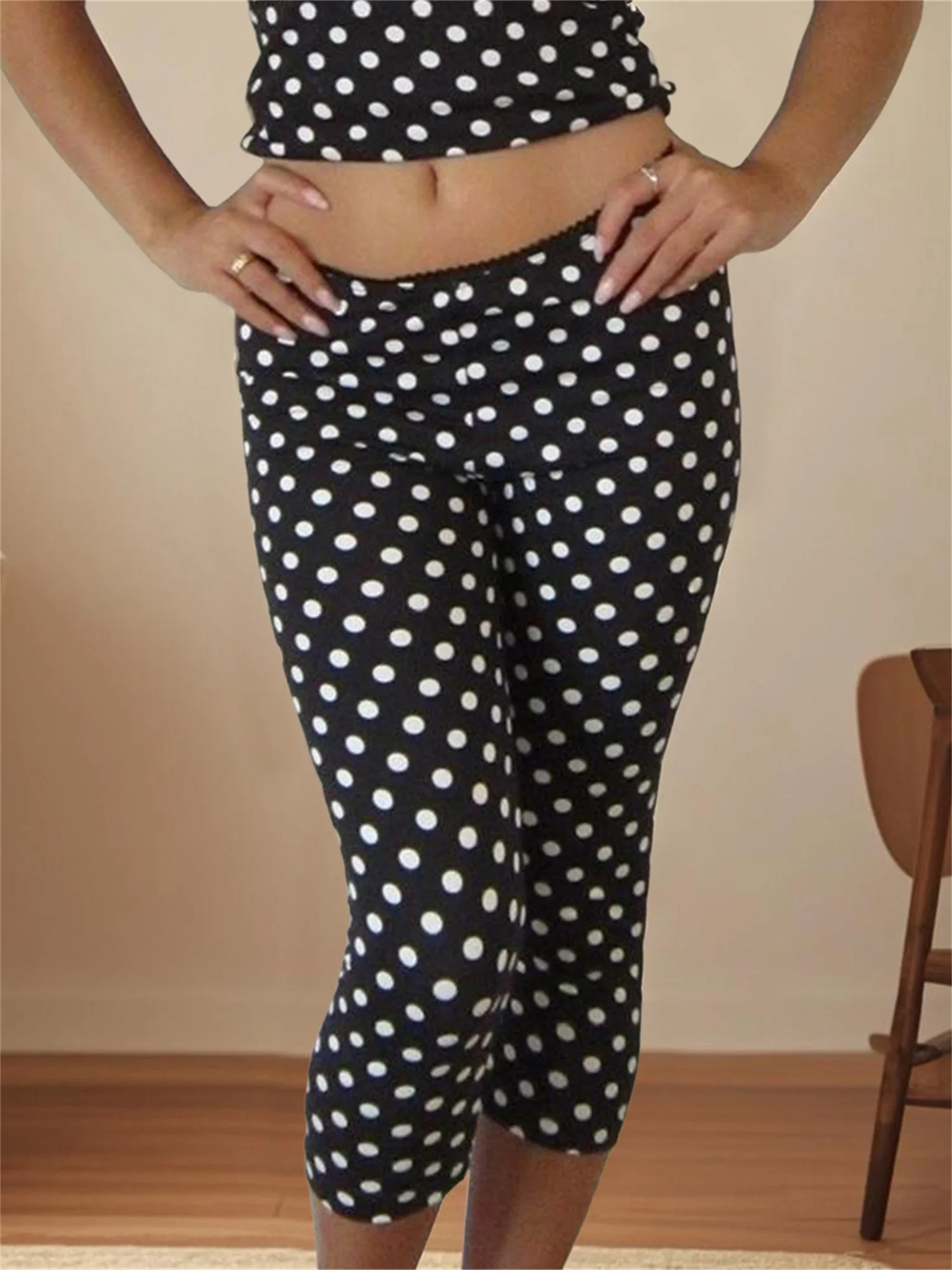 Women Dot Print Capris Lace Trim Low Rise Leggings Fit Cropped Pants for SummerSize (cm)