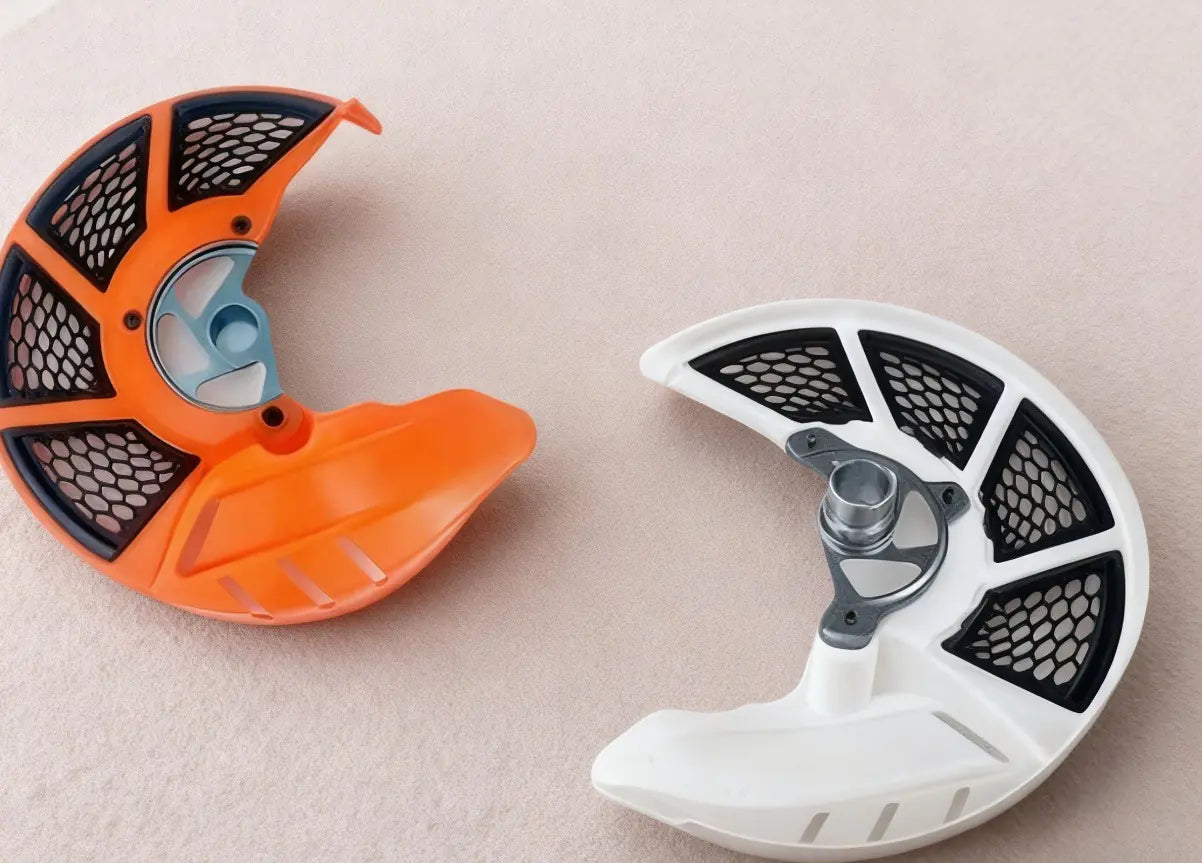 Fits EXC EXC-F SX SXF XCF models from 2003 to 2015. This durable front brake disc rotor cover comes in orange. Made of plastic and metal, it measures 350x230x130 mm. Included: 1 front brake disc rotor cover.