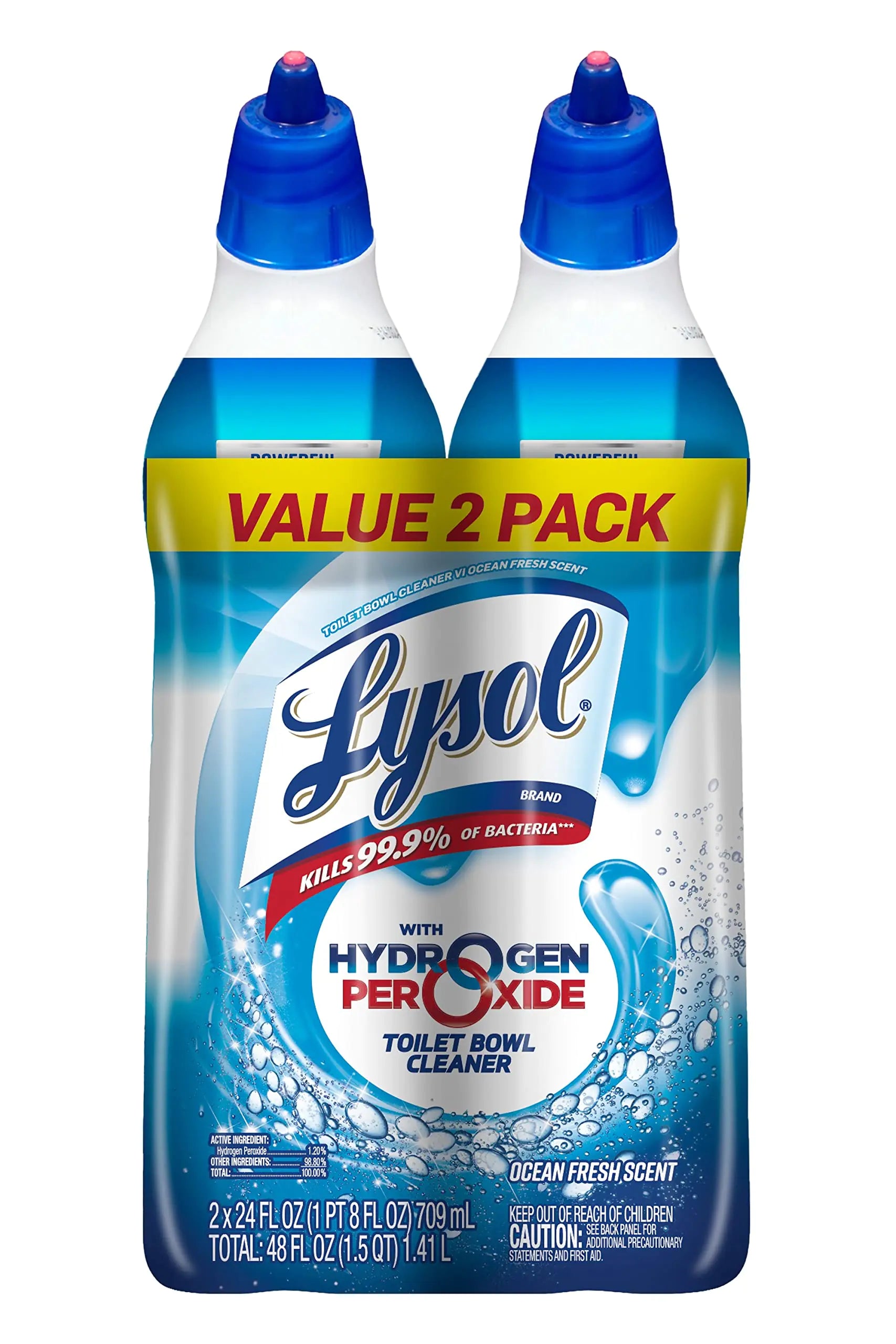 Lysol Hydrogen Peroxide Toilet Bowl Cleaner uses hydrogen peroxide to dissolve even the toughest toilet stains. This powerful new cleaning formula uses hydrogen peroxide to release thousands of micro-bubbles that dissolve tough toilet stains. This lime scale remover even cuts through lime scale without the harshness of bleach. Lysol Hydrogen Peroxide leaves behind no chemical residues: just a clean fresh scent. The thick formula clings to the bowl brightening your toilet as it cleans and disinfects. The angled bottle targets hard-to-reach areas including under the rim leaving your entire toilet bowl sparkling clean deodorized and disinfected.