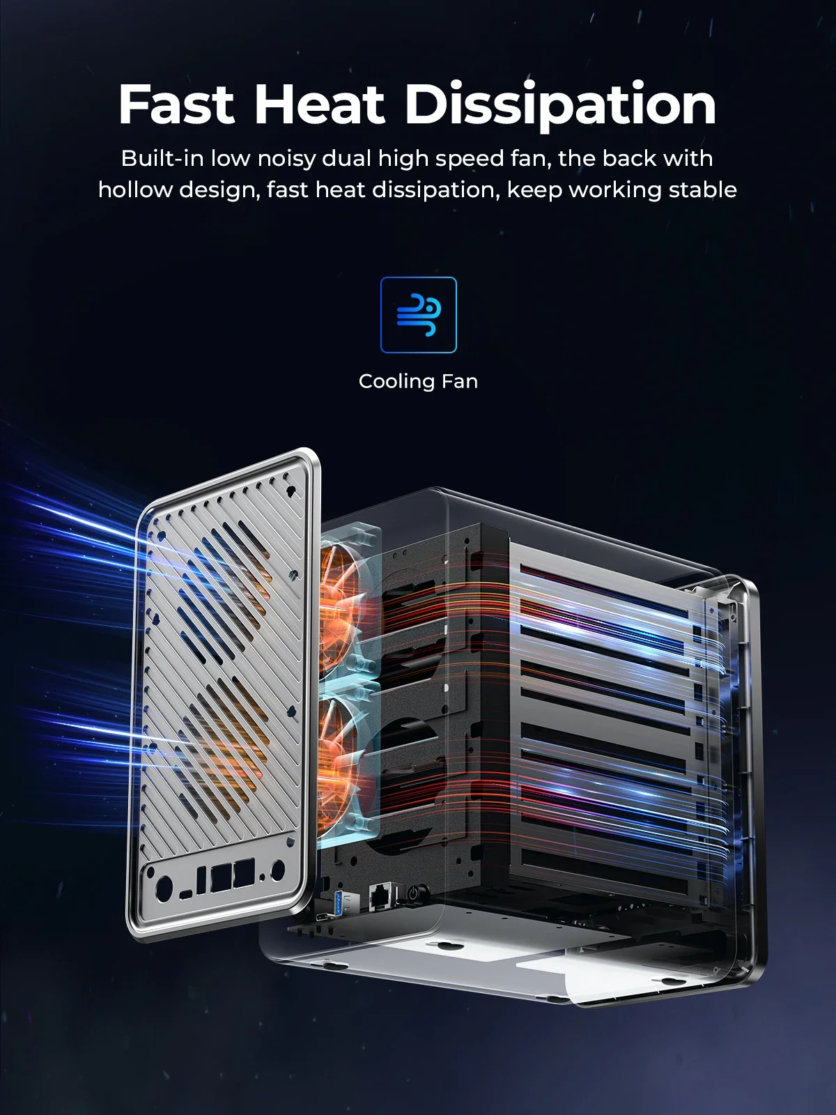 Built-in low noisy dual high speed fan, the back with hollow design