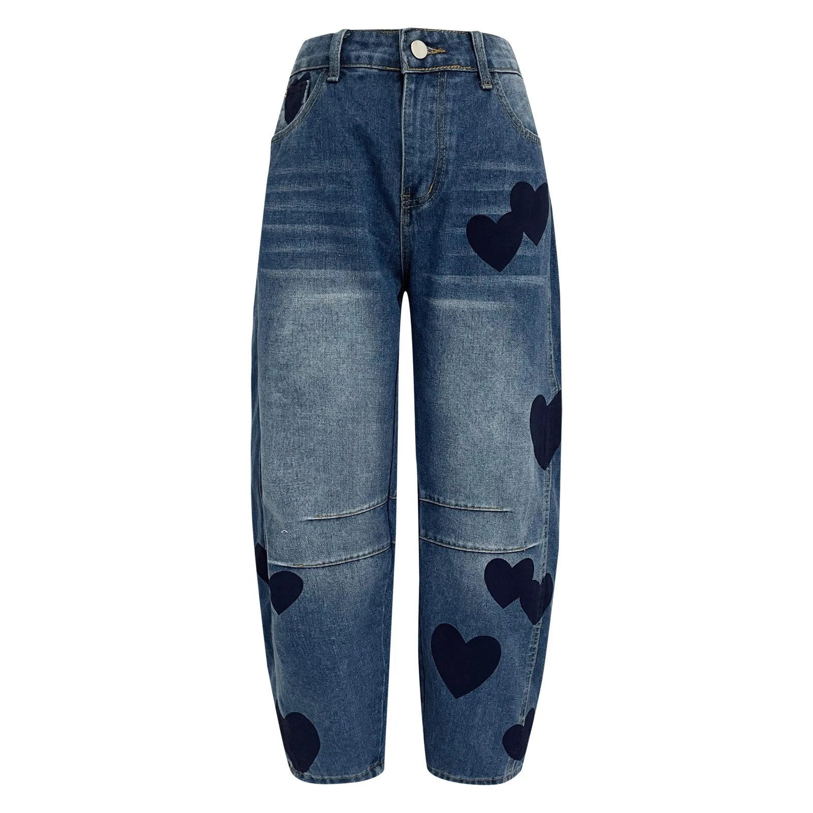 Design: Our Heart Printed Ankle Length Jeans feature a barrel leg and mid rise, relaxed, loose, and wide-legged fit. The unique heart print a fun and personal , making these jeans a fashionable must-have. Women ankle barrel pants.