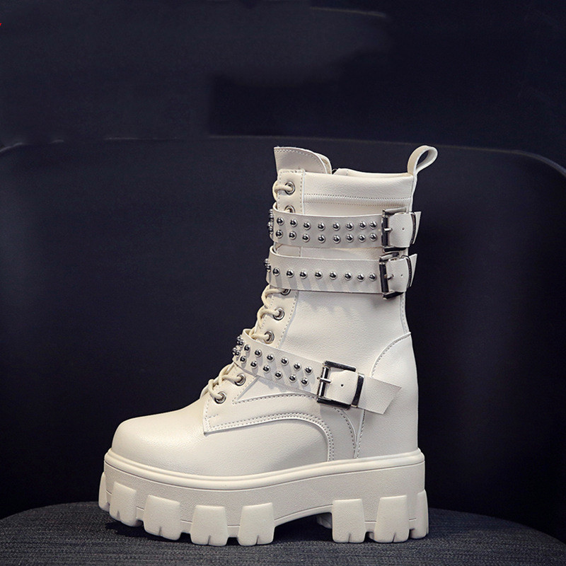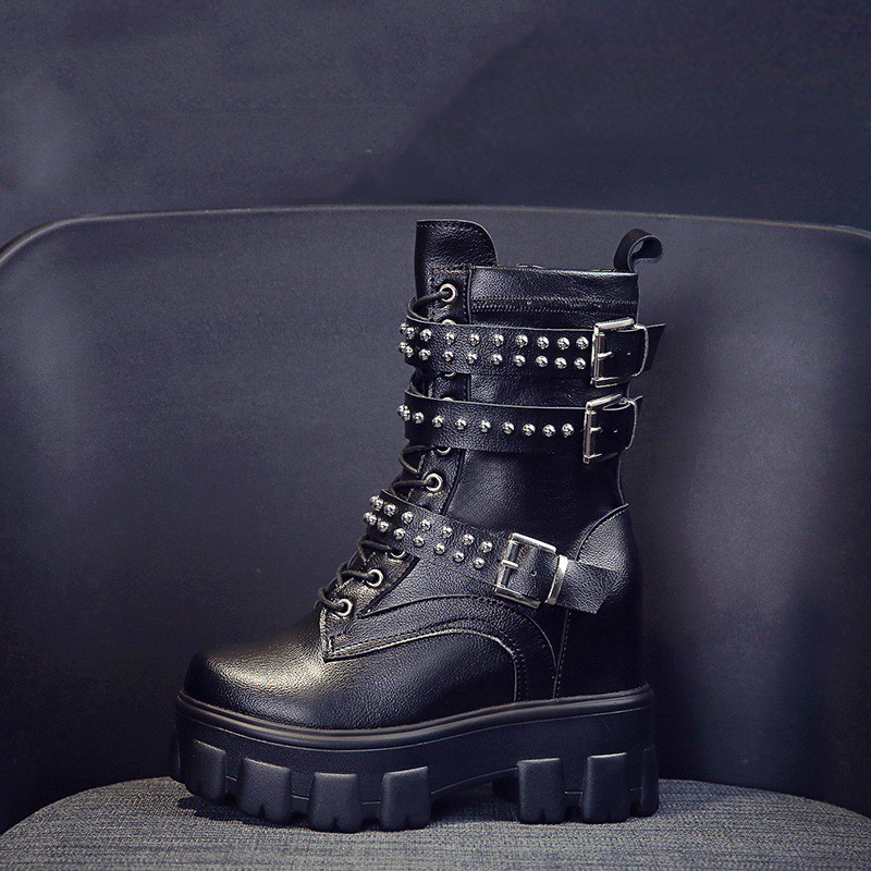 Featuring a trendy round toe and a side zipper for easy wear, these boots are adorned with stylish cross straps and metal decorations that elevate their aesthetic appeal. The waterproof platform ensures that you can tread confidently in any weather, making these boots a versatile addition to your wardrobe.